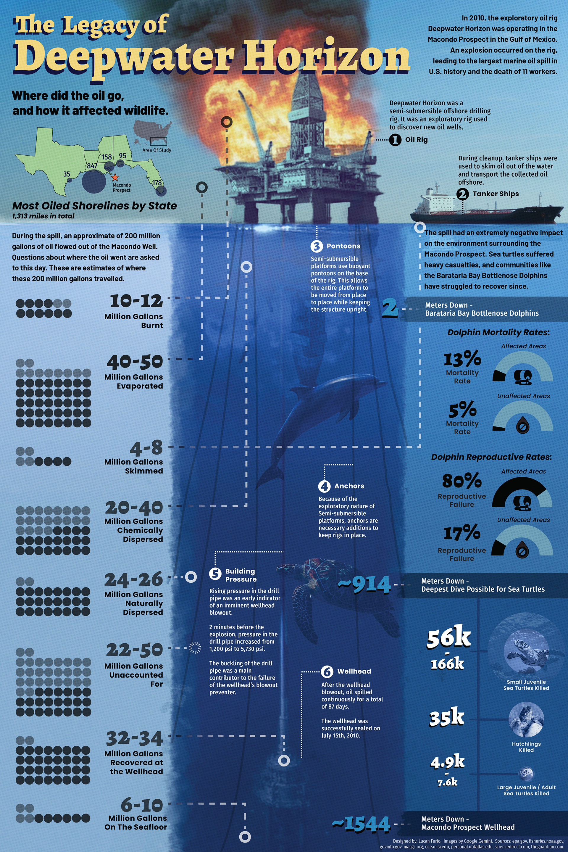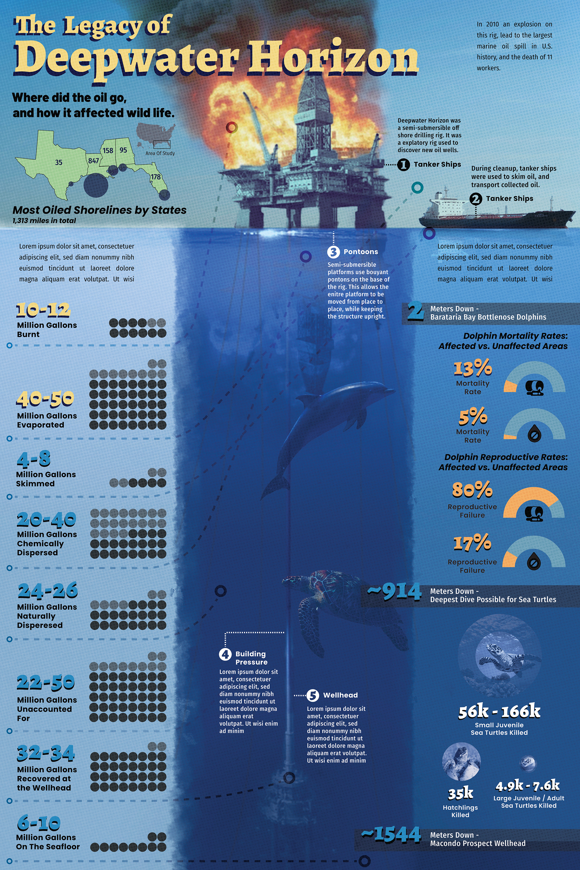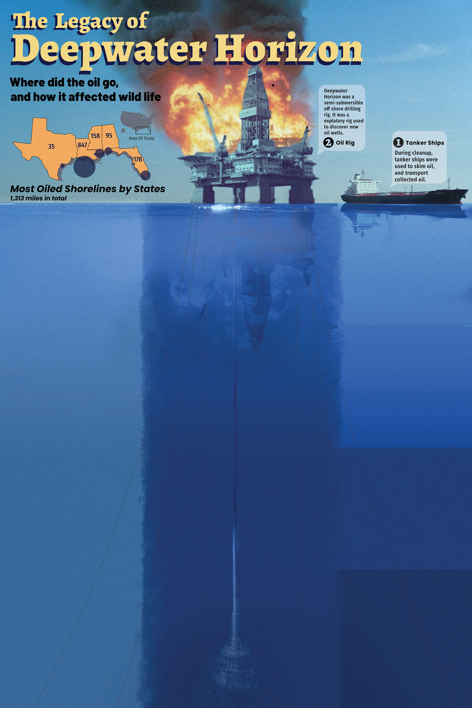 A large infographic piece focusing on the environmental impact and cause of the 2010 Deepwater Horizon oil rig explosion.