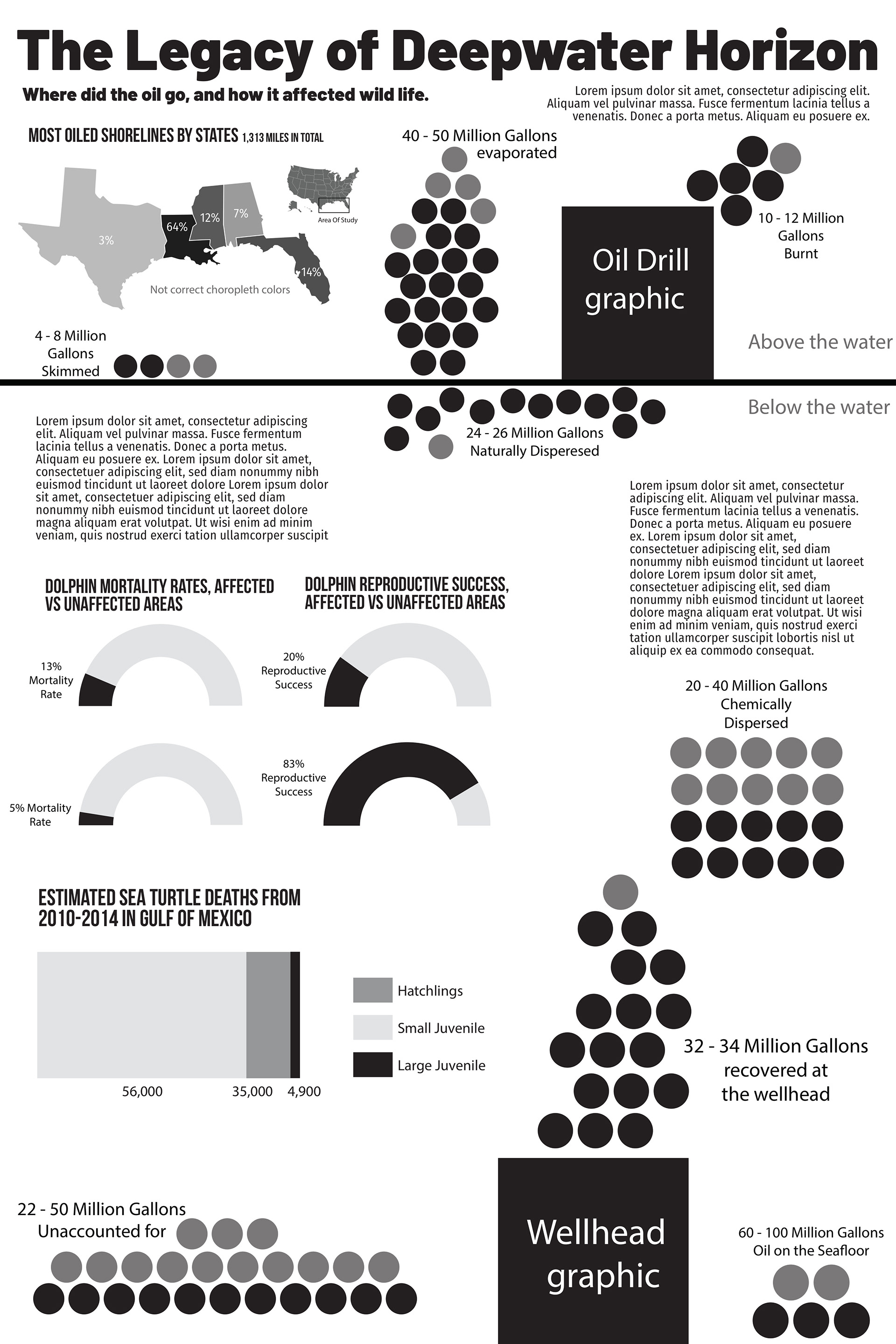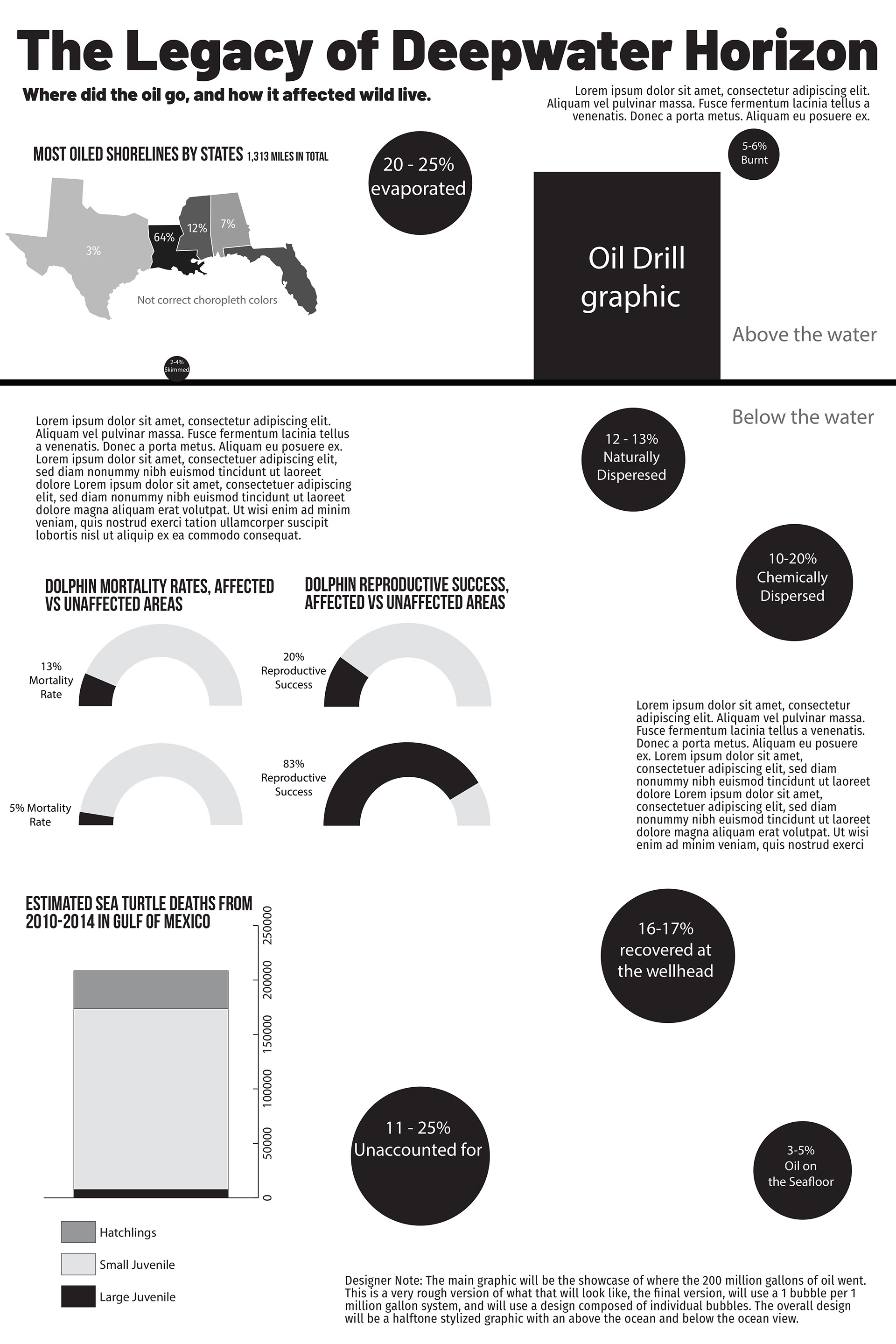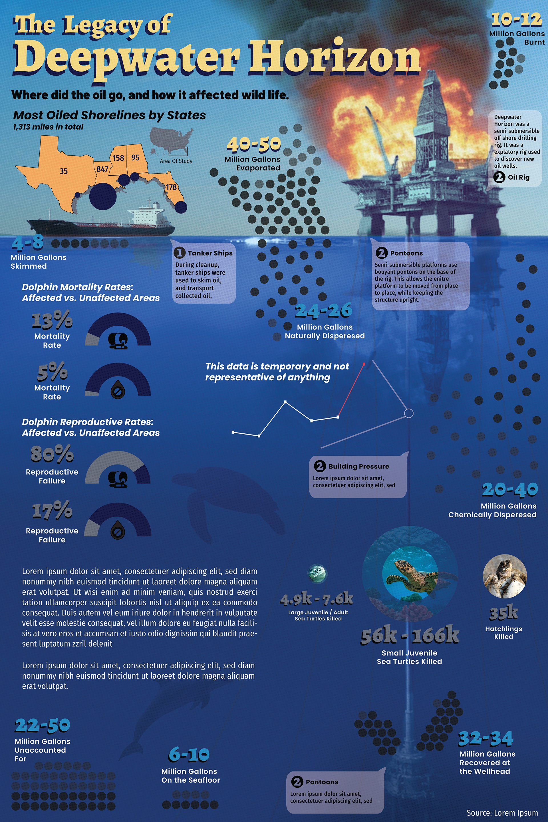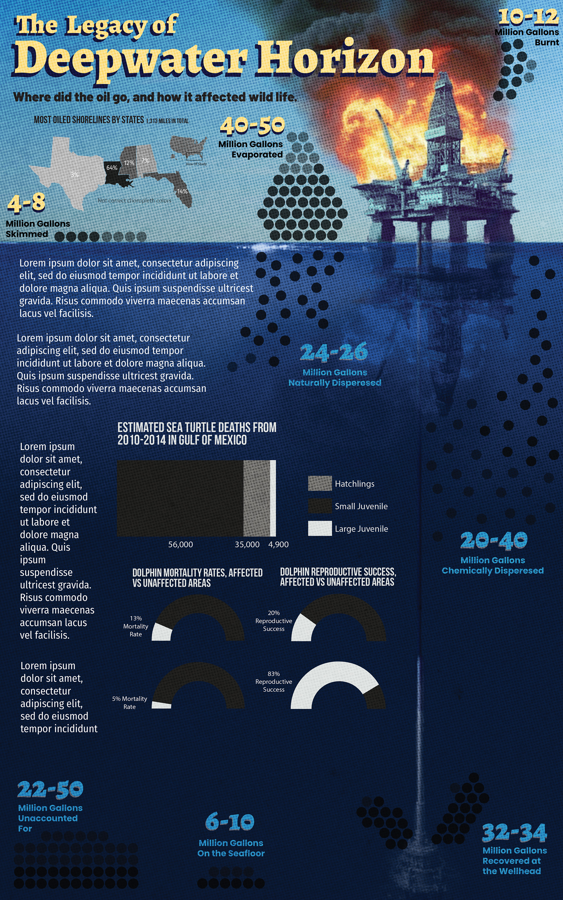 A large infographic piece focusing on the environmental impact and cause of the 2010 Deepwater Horizon oil rig explosion.