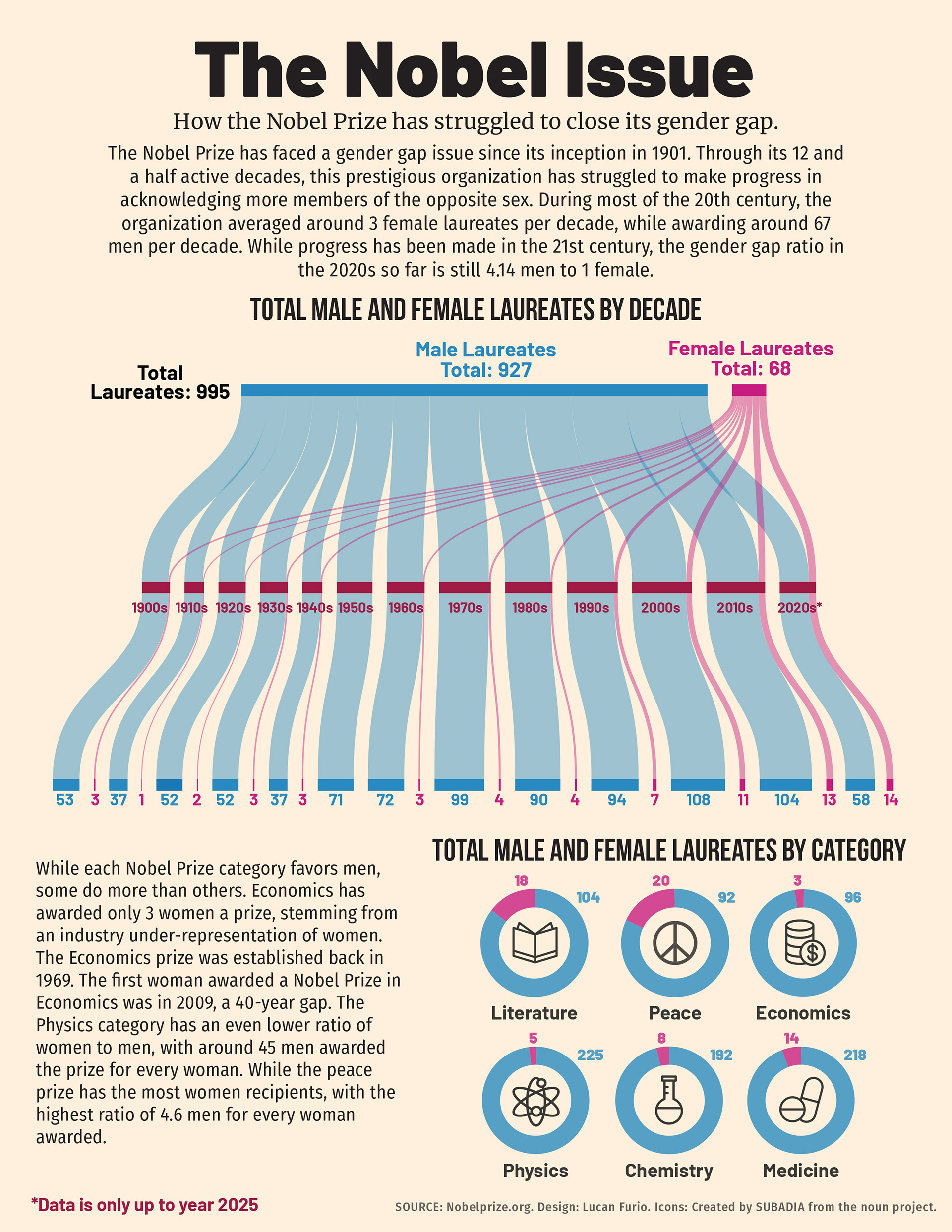 My first infographic developed for VICO 3111. It showcases the prominent gender gap that has existed since the award's inception in 1901.
